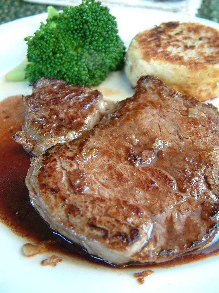 - After the wine has reduced by a third, pour the wine sauce over the steaks and serve.