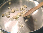 - にんにくを薄く切る。 フライパンにサラダオイル 大さじ1と胡麻油 小さじ1を弱火で熱し、にんにくを透き通るまでゆっくり炒める。焦がすと苦味が出るので、弱火か中火で。