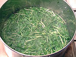 - 大きな鍋に小さじ1/2の塩を入れて湯を沸騰させ、豆苗を全部いれ2分ゆがく。直ぐ熱湯を捨て、冷たい水で洗い流す。コランダーかざるで良く水をきる。