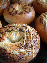 参考サイト videojug.comのベーグル ここでは「ニューヨークスタイルのベーグル」を動画で紹介しています。カラメル湯にポーチする穴の大きなベーグルの作り方です。カラメル湯につけて焼き色を濃くしています。穴の作り方は繋ぐ方法や、指で生地に穴を開ける方法や色々。 これを見ると形にこだわらないで楽しくつくればOKという気持ちになります。