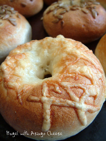 ベーグルの上にトッピングを乗せて焼きたい場合はトッピングも用意してください。 ここでは アジアゴチーズ(Asiago Cheese)、向日葵の種、ペストソースをつけました。アジアゴチーズの代わりにパルメジャンチーズ、或いはお好きなチーズをお使い下さい。