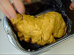 | 粉類をかぼちゃに少しずつ加えて、握りつぶすようにして、混ぜ込む。最初はぱらぱらで水が足りないように思えますが、つぶし込んでいくうちに、だんだんまとまってきます。大体まとまったら、打ち台に取り出して、手でもっとまとまるまで捏ねる。 まとまらないうちにHBに入れると、最後までまとまらない時がありますので、HBを使う場合も、まとまってから入れてください。カボチャによっては生地が硬過ぎる時はほんの少し水を加えてください。捏ねていて何時までも手に生地がべちゃべちゃくっつくようであれば、粉を少々加えてください。 |