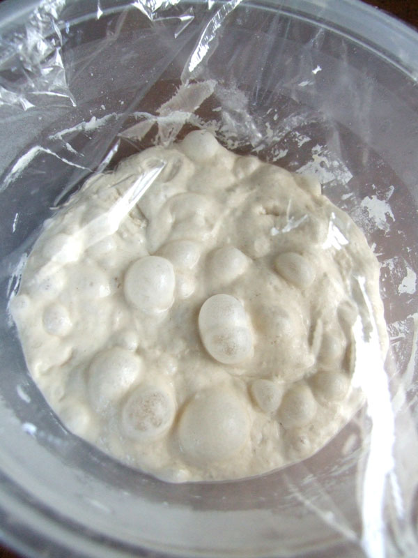 | 先ず、6時間〜24時間かけて水種を作ります。 水種の発酵時間は室温、湿度、一つまみのイーストの量によってかなり違います。 水種がぶくぶくと泡立ってきた時が完成です。 発酵のピークを過ぎると凄し上面が落ちてきます。 ピークを過る前に使いましょう。 ピークの時に使えないようであれば、ラップをして冷蔵庫で数時間おいても大丈夫です。