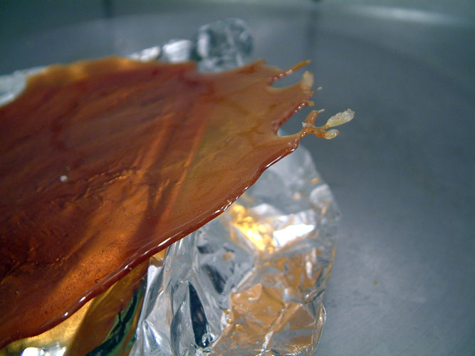 冷えて硬くなってきますから、熱いうちにお箸の先で広げて行きます。 お箸が糸をひくようになったら広げるのを止めます。 |
