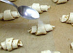 | 生地の表面に軽く卵白 + 水 少々を塗る。 全体にフィリングをのせる。 12個に分割する。巻く。 |
