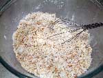 | オイルと粉の大きな塊を泡だて器の先で小さく潰すようにして、粒々が均等になるようにします。(クリーンピースくらいの粒々) |