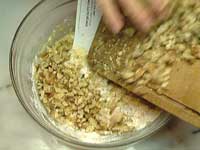 | 用意した胡桃を加えて最小限で混ぜる。 粉のつぶつぶが見えるくらいの混ぜ方で丁度良いです。 混ぜ方はビデオをご覧下さい。 |