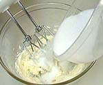 (2)3回くらいに分けて、砂糖 50グラムを加え、その都度、よくハンドミキサーで混ぜる。 |