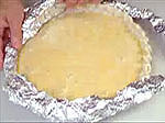 まだ焼いていないパイの皮に流しいれる。 長く焼くのでパイ生地が焦げないようにアルミ箔で端だけを軽くカバーする。最初は210度で10分、170度に温度を落としてさらに40分から45分焼く。中心が少し盛り上がり、串を刺して何もつかなければ焼き上がり。プリンの様に低めの温度で焼くと、なめらかな出来上がりになります。パイ皮無しのかぼちゃプリンの時は、最初から低い温度170度で焼いてください。表面全体が少し盛り上がって、串をとおして何もついてこなかったら出来上がり(約20分)。プリンの焼き方を参照してください。