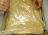 シートを敷いた型に流し込む。上を平らにして、3回程上から落として大きい泡を除く。 170度C(330度F)に予熱したオブンに入れて約10〜12分焼く。写真の型は23cmx30cmです。