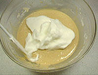 泡立った卵白の1/3を卵黄に加えて、色が均等になるまで、ワイヤでしっかりと混ぜる。残りの卵白を加えて 色が均等になるまで、へらで生地を底からすくい上げ、上にかぶすようにして手早く混ぜる。
