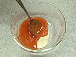 上のピューレーから小さじ2ほど取り出して、ゼラチンと混ぜる。 残りのピューレーは電子レンジで沸騰させた後、ゼラチンを加えて良く溶かす。