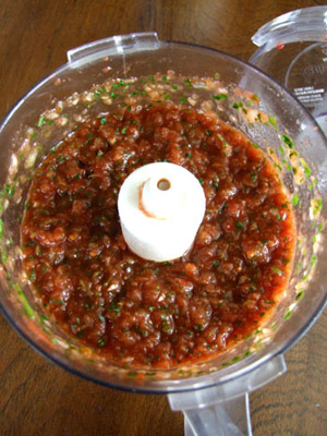 Blend tomatoes, cilantro, jalapeņo, red onion, cumin, coriander and salt in a food processor